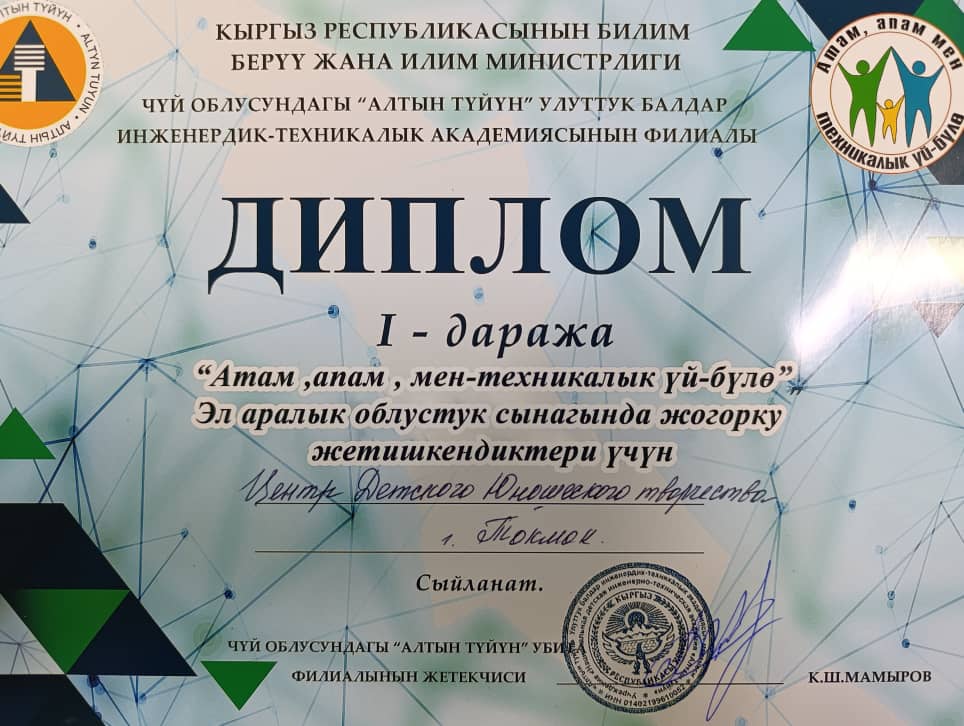 11 ноября на базе ЦДЮТ г. Токмок прошел областной тур республиканского конкурса «Папа, мама, я — техническая семья». По итогам конкурса команда ЦДЮТ заняла 1 место, и представит Чуйскую область в республиканском конкурсе.